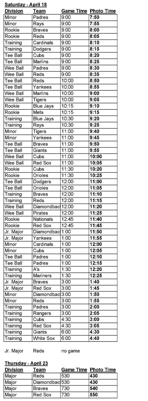 Game Schedule: Game schedules will be released by the end of March. Games will start the week after SCS spring break. Regular season games should end by June 1st and tournament games will end no later than June 10th. Most games are played Monday - Saturday. However, some make-up games could be scheduled on Sunday afternoons if needed due to rainouts..